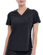 This modern V-neck top offers a versatile look—wear it tucked in or left out. Designed with breathable knit mesh at the neckline, it features a half welt chest pocket and flattering back princess seams. The shirttail hem adds a polished touch. Center back length measures 25 inches.