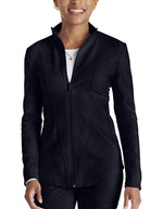 This zip-front mock-neck jacket offers a sleek, modern silhouette with a flattering fit. Designed with activewear-inspired details, it includes front zip pockets, contoured seams, and breathable power mesh panels at the sleeves and racerback. Stylish yet functional, it provides a contemporary fit and measures 26" at the center back.