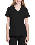 This modern classic fit V-neck scrub top features functional details that enhance its simple style. A flat bungee on the neckline offers an easy ID badge loop, while two spacious patch pockets include reverse hem trim. Side vents provide mobility, and tonal topstitching adds subtle flair. Center back length measures 26 inches for a polished look.