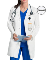 Crisp, clean, and effortlessly stylish, the Free Embroidery Modern Classic Fit Lab Coat offers a polished professional look. Designed with notched lapels and a four-button front closure, it ensures a tailored fit with front and back princess seams. Functional and versatile, it features three pockets—one chest pocket with an instrument loop and two front tablet pockets—along with two back shoulder yoke seams and an elastic bungee locker loop for added convenience.