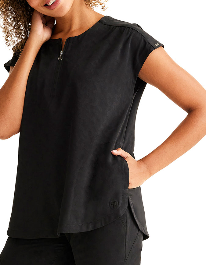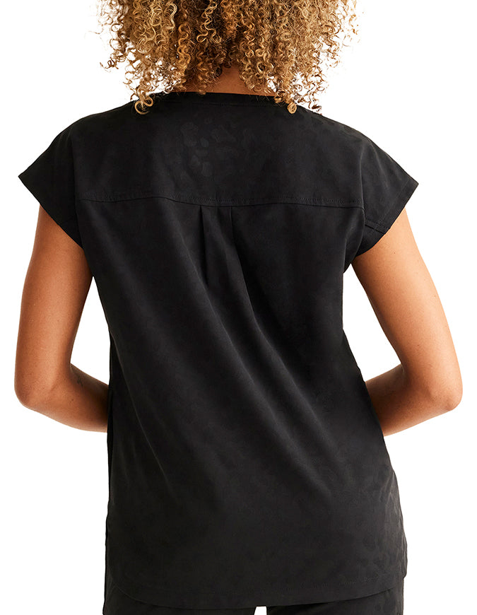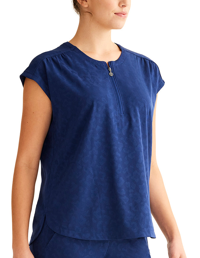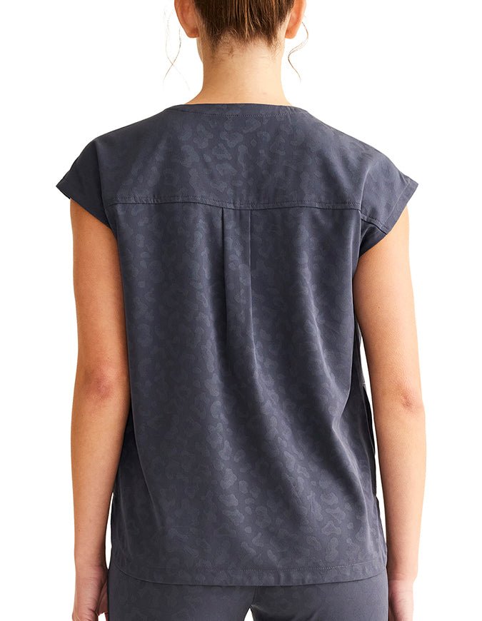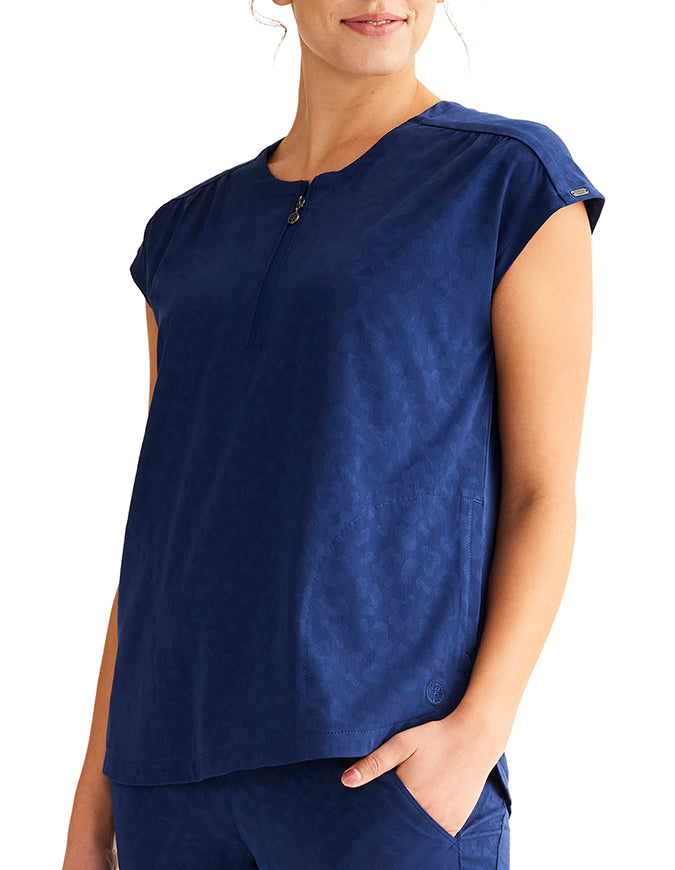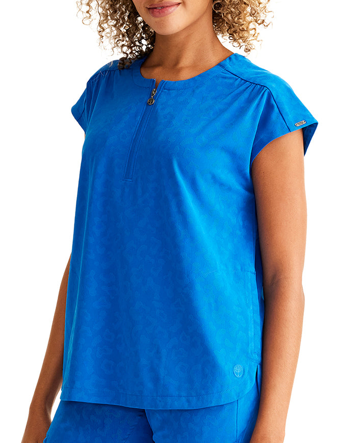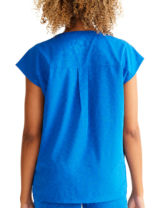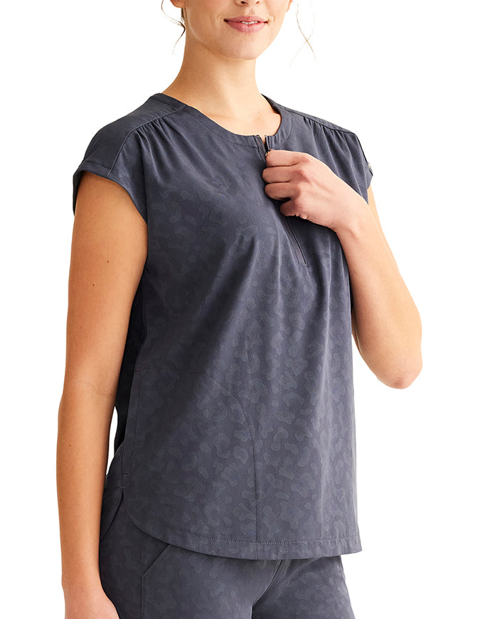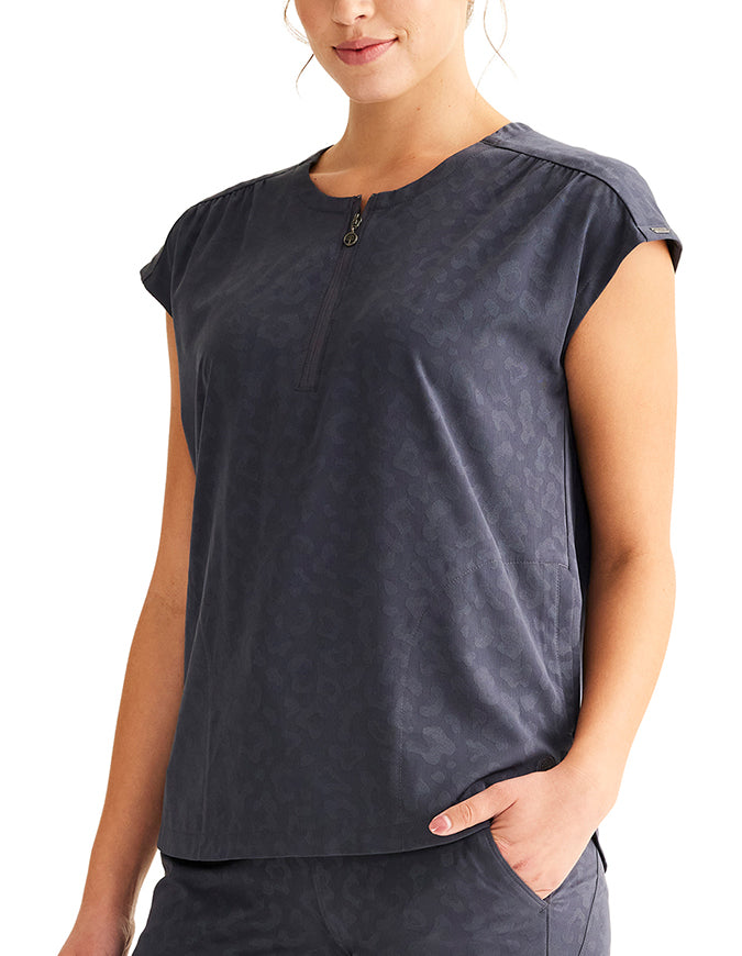 Refresh your workwear with the Jayden Leopard Jacquard Scrub Top from Healing Hands Purple Label. Designed to make a bold statement, this top features a chic leopard jacquard pattern and a trendy zip collar that adds a modern touch to your professional look. Crafted with performance fabric and a modern oversized fit, it blends fashion, comfort, and functionality seamlessly—perfect for long shifts or busy days.