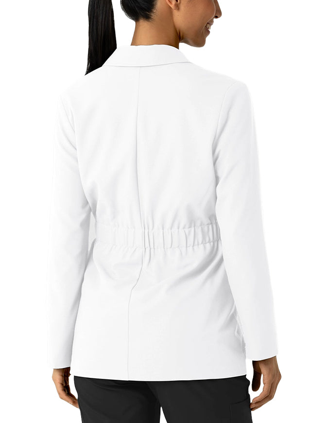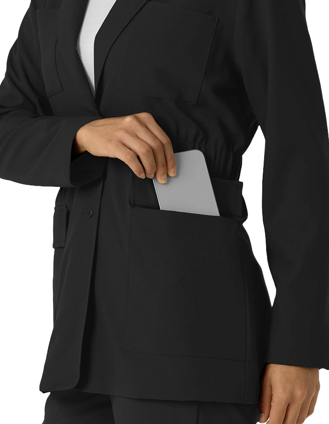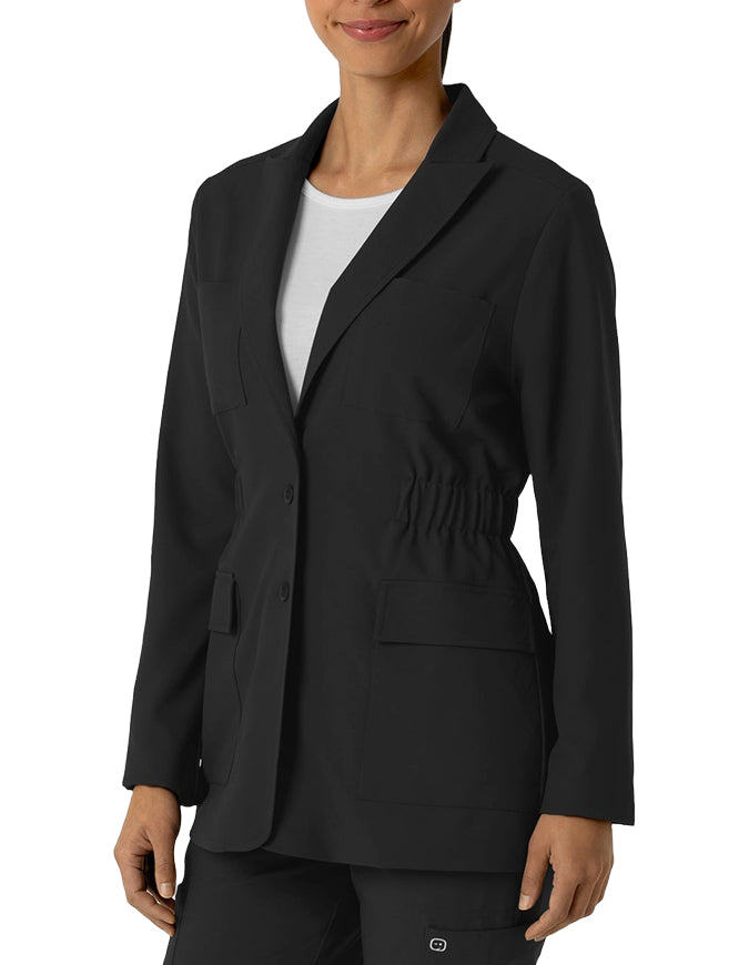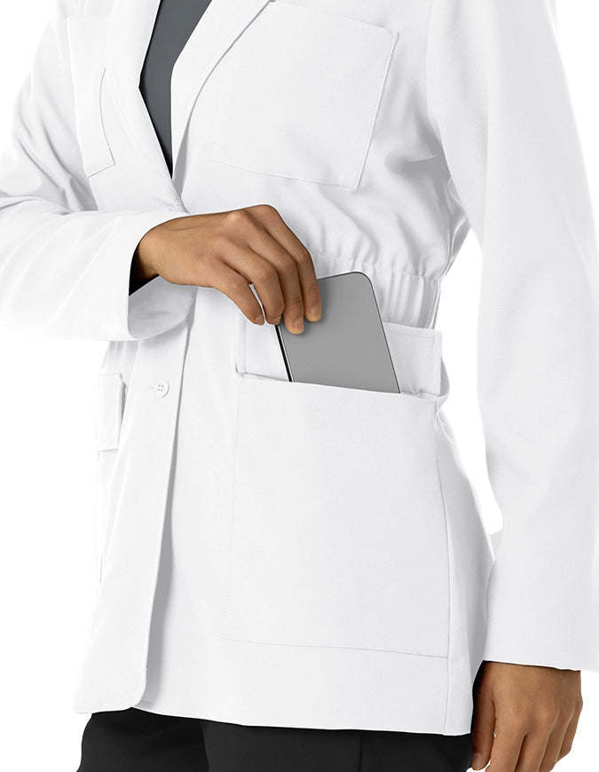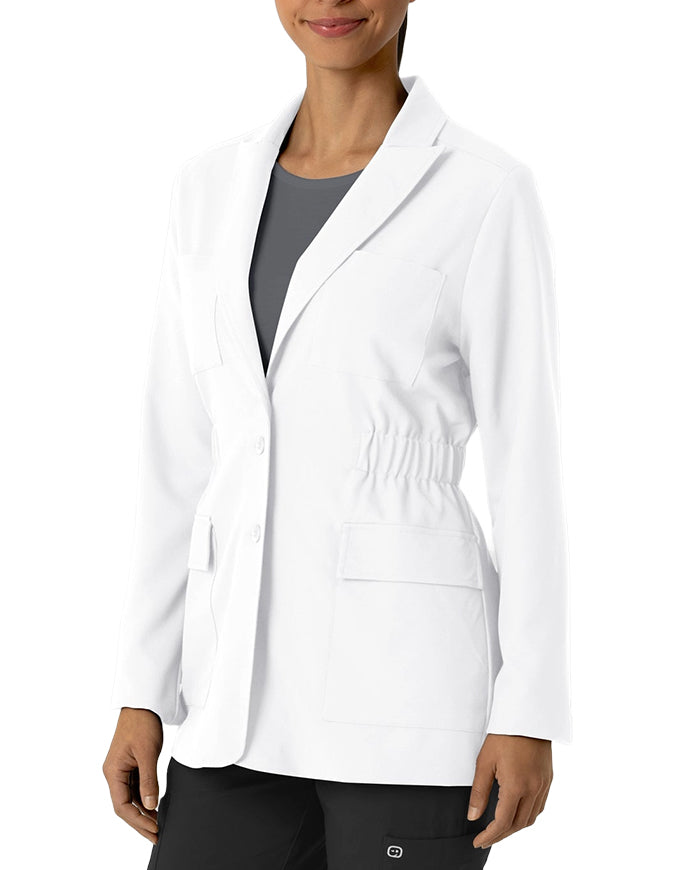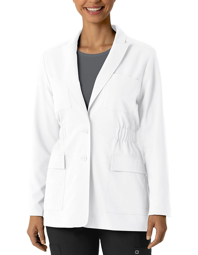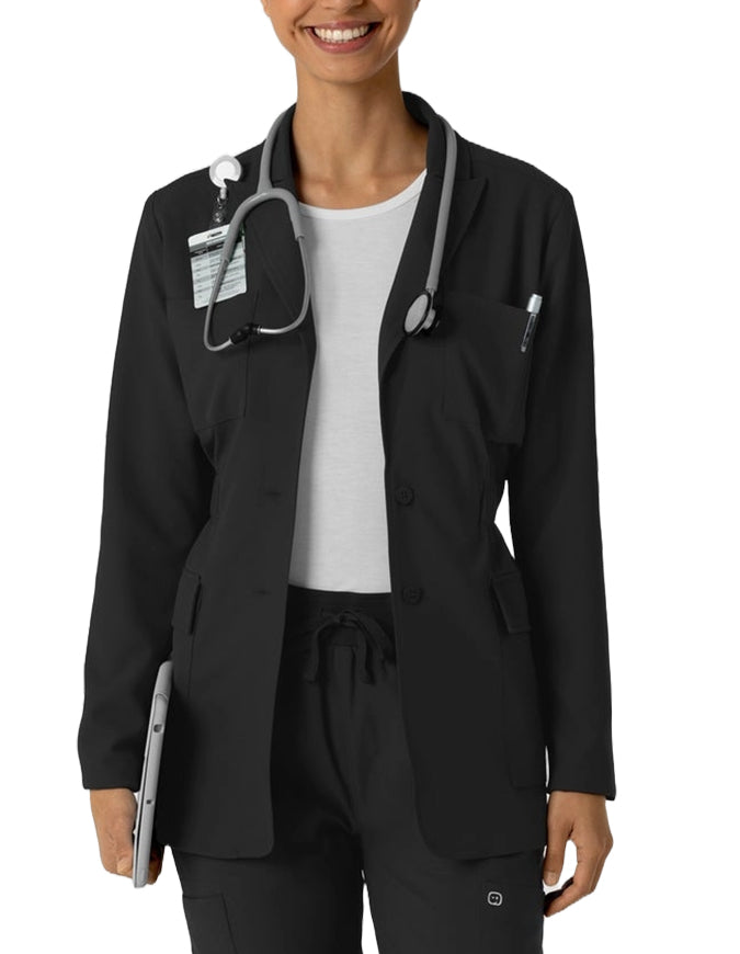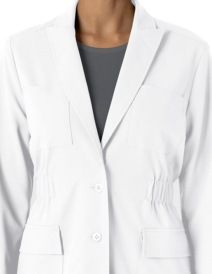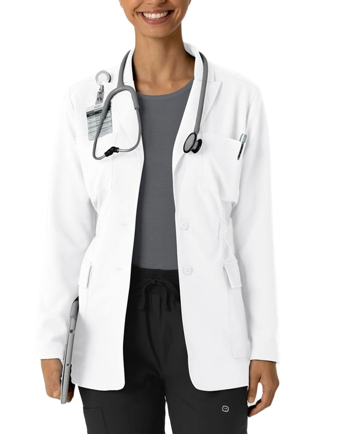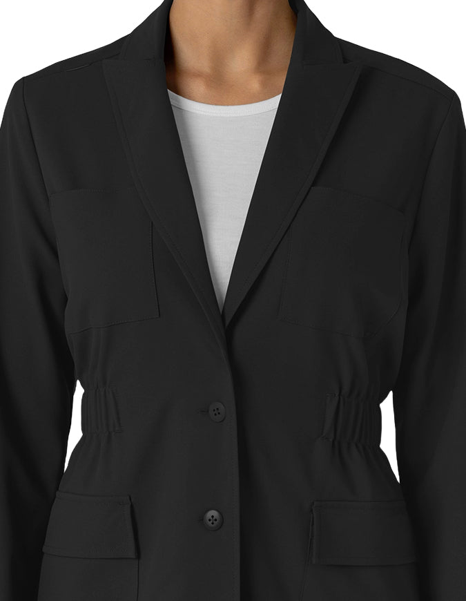 This women's lab coat combines professional style with practical function. Made from sustainable fabric, it features notched lapels, a button front, and four roomy pockets—two chest and two cargo—for everyday essentials.