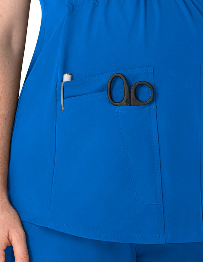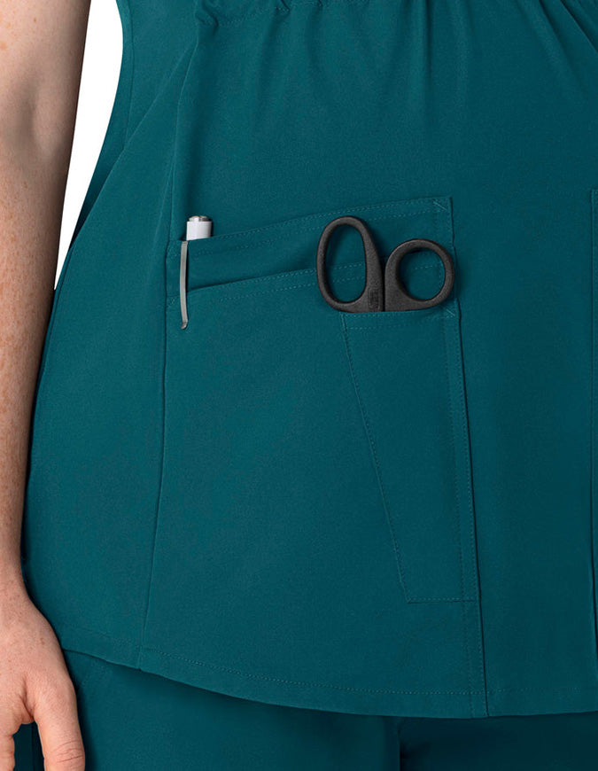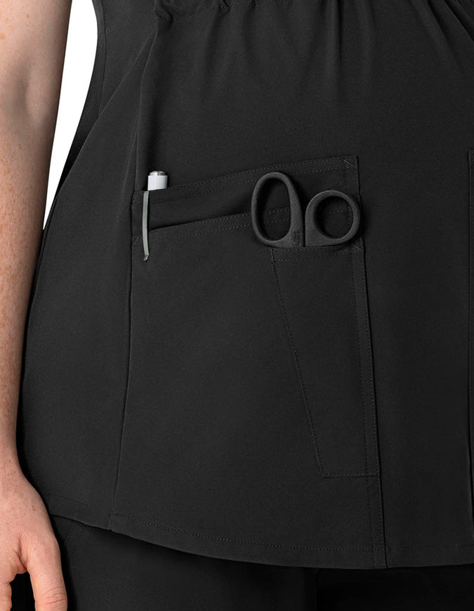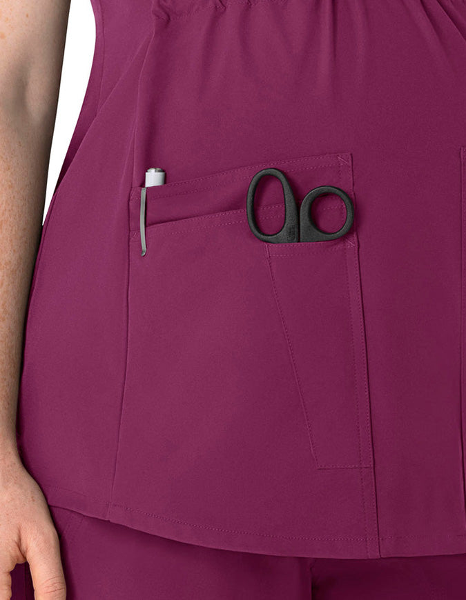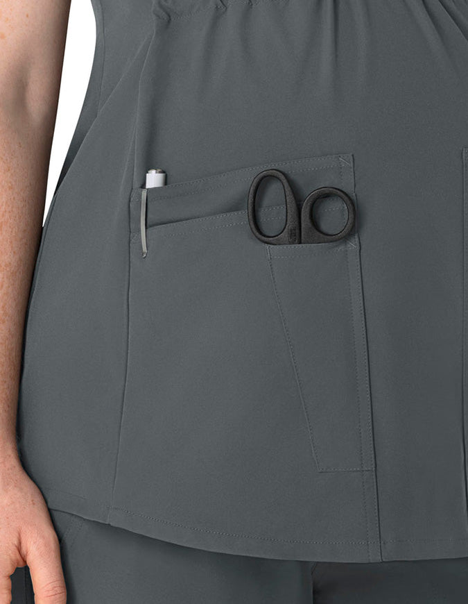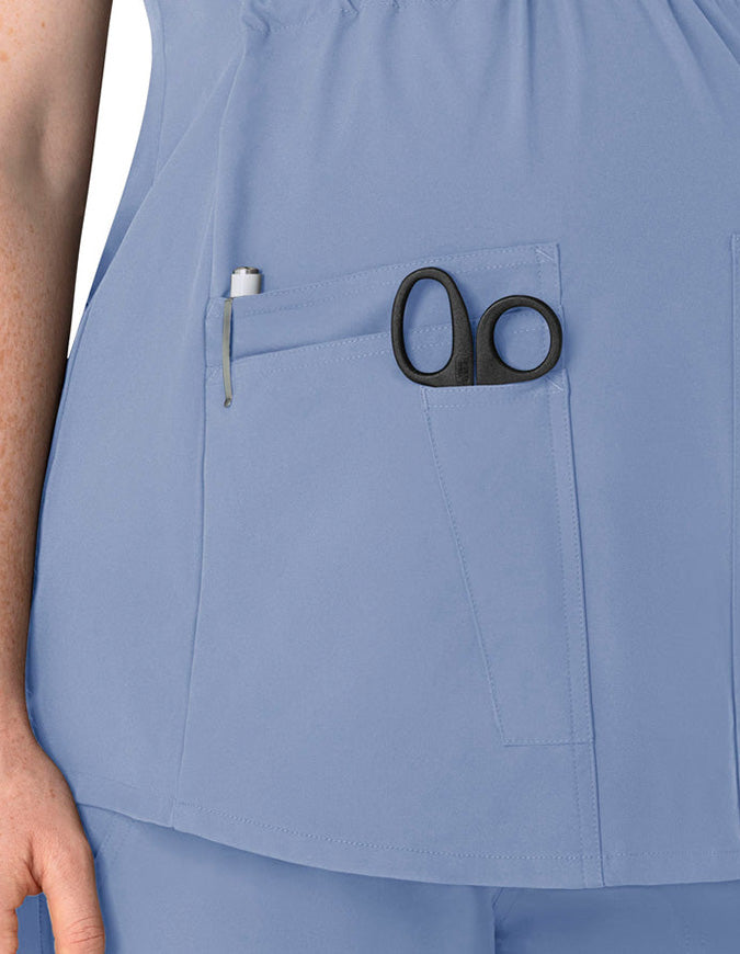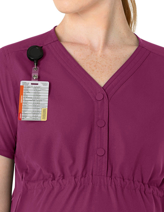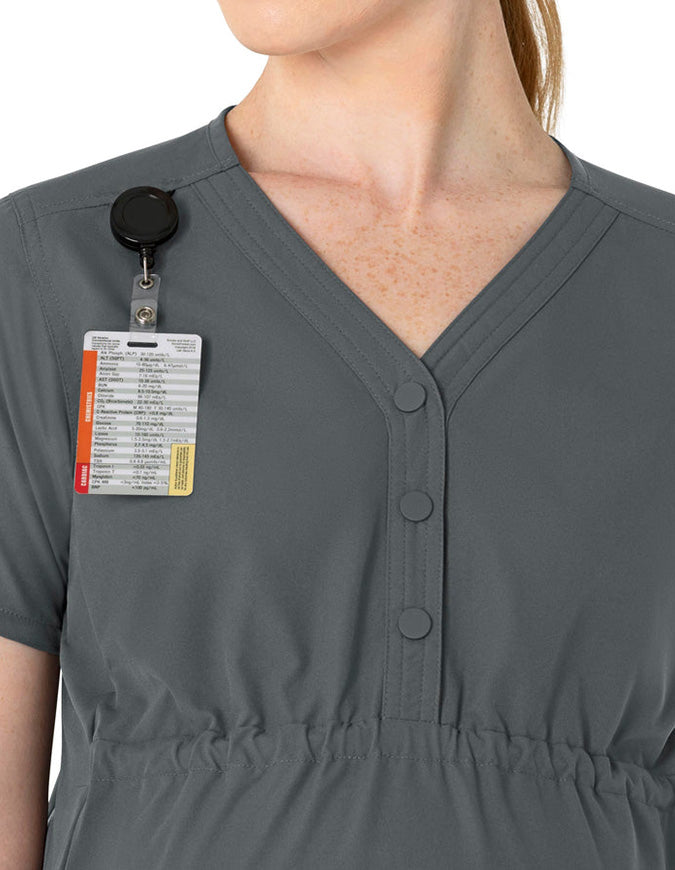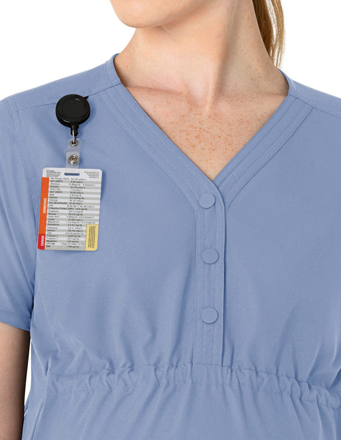 Stay focused and comfortable during your pregnancy with this thoughtfully designed maternity scrub top. It features two spacious front pockets, one with a mesh insert for your phone, a right-side scissor pocket, and a badge loop on the shoulder. An adjustable empire waist grows with you, while a curved hem and snap Henley neckline add style.