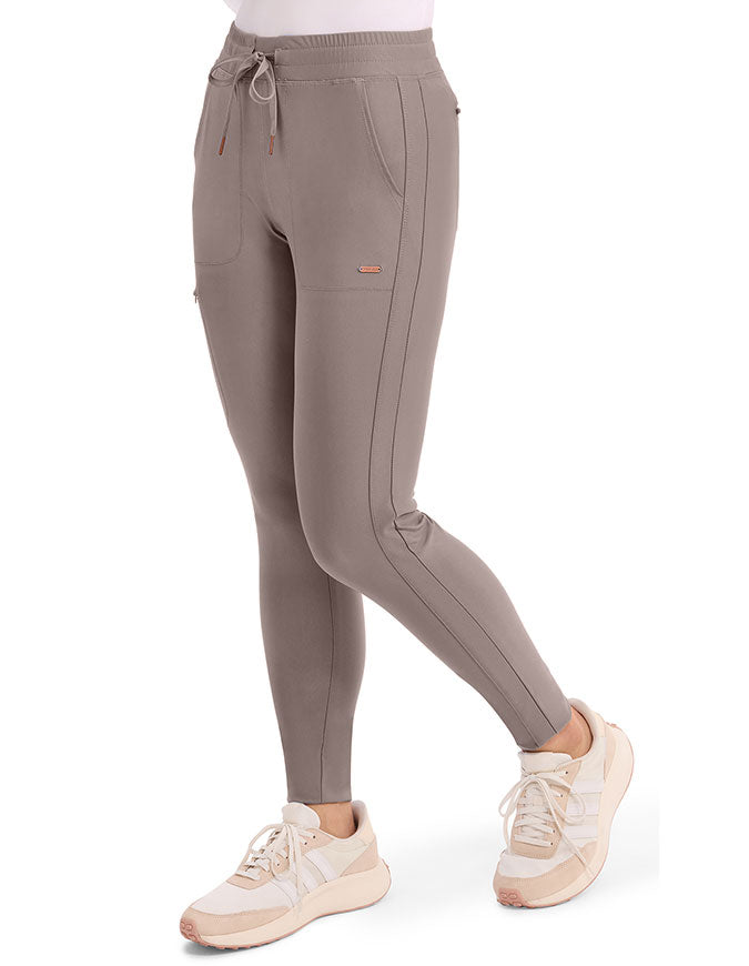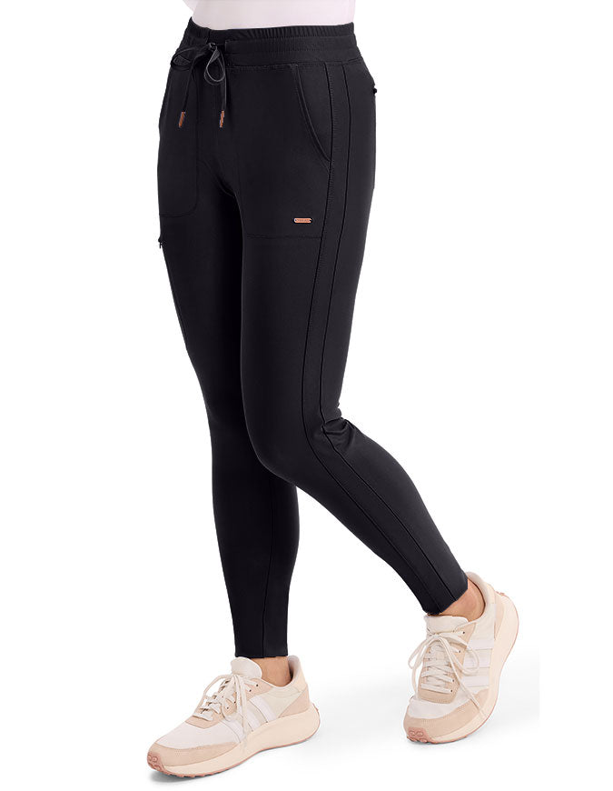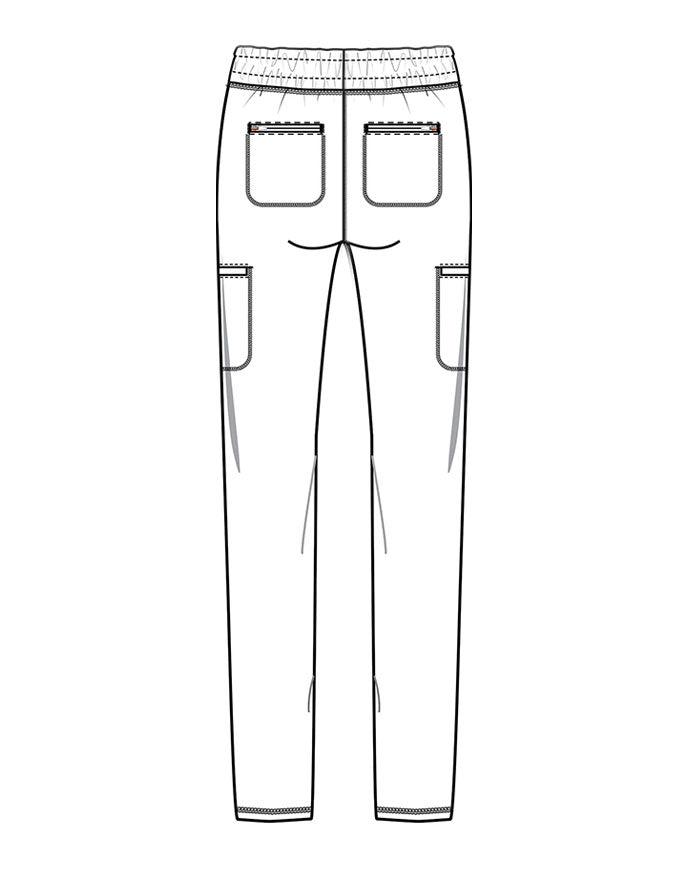 With a contemporary mid-rise style, these pants are designed for function and fashion. The elastic waistband is multi-stitched and paired with a drawstring featuring antique copper tips. It includes two front angled pockets, one zip cargo, and two zip back pockets. The tapered leg has a 9.5" opening and a 26.5" inseam.