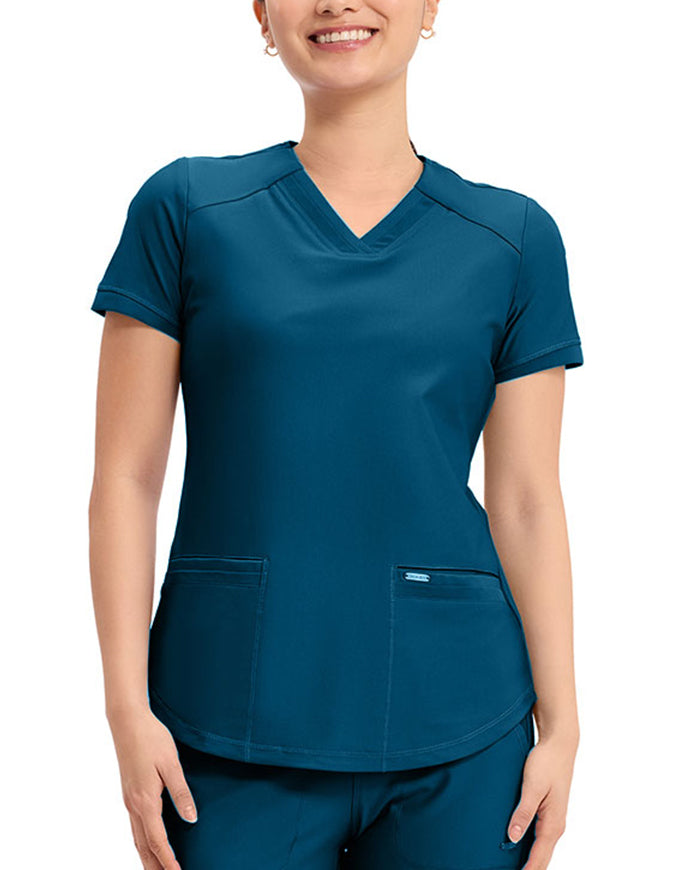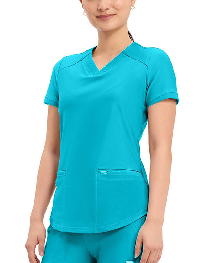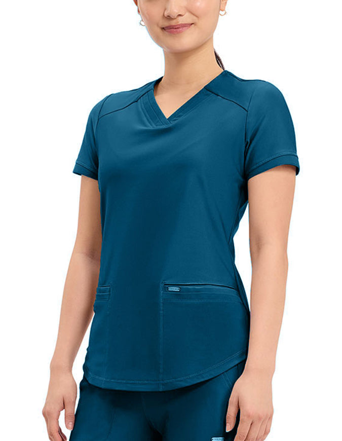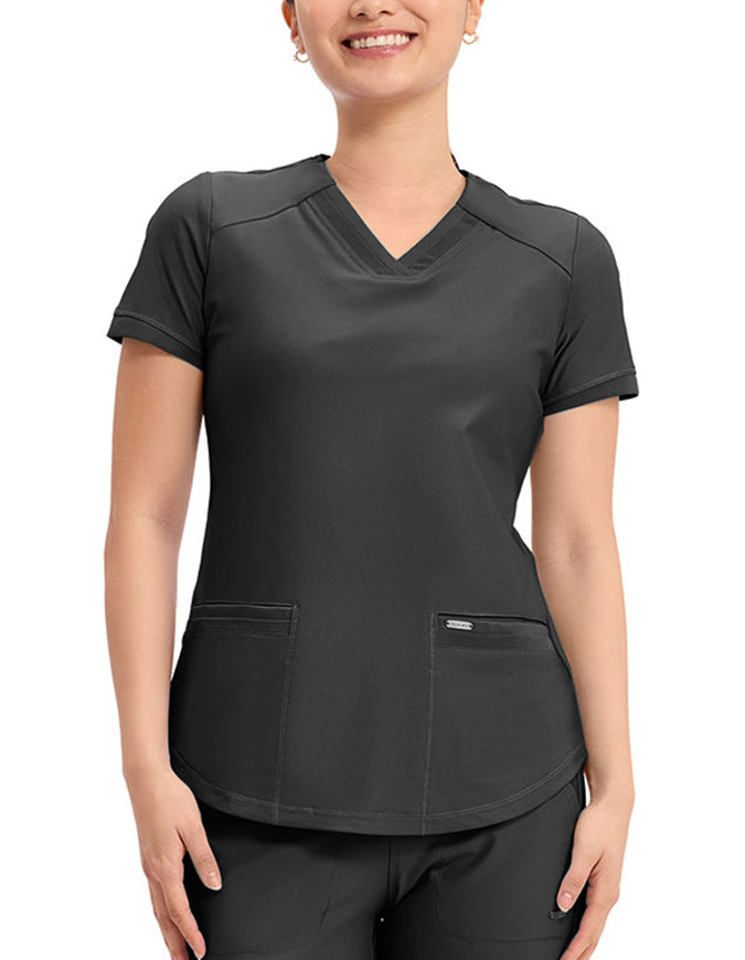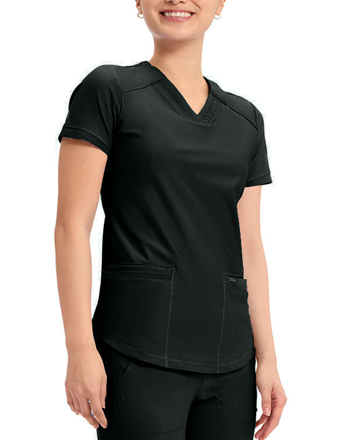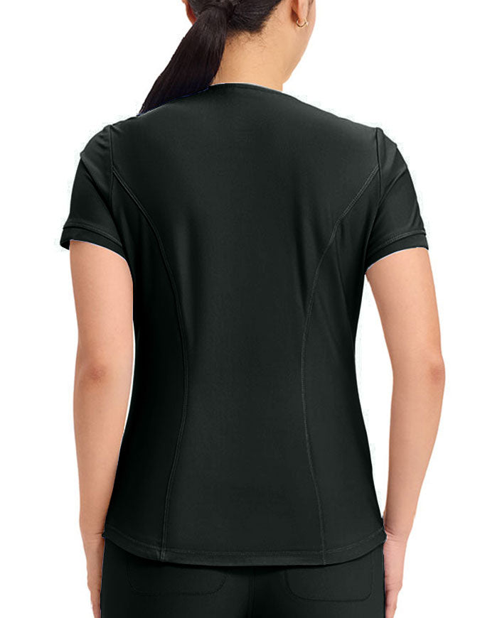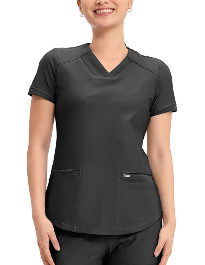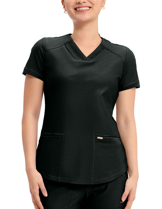 This stylish V-neck scrub top offers a modern curved hem and subtle power mesh detailing at the neckline and sleeve ends. Designed with two spacious front welt pockets, angled front yoke panels, and back princess seams, it enhances your silhouette beautifully. Features a contemporary fit with a center back length of 26 inches.
