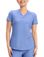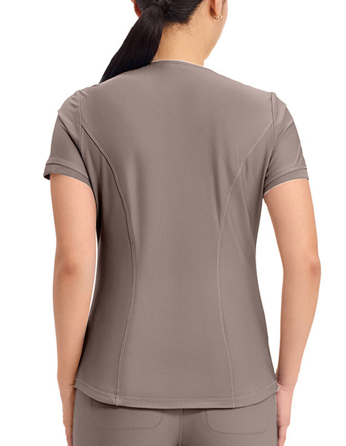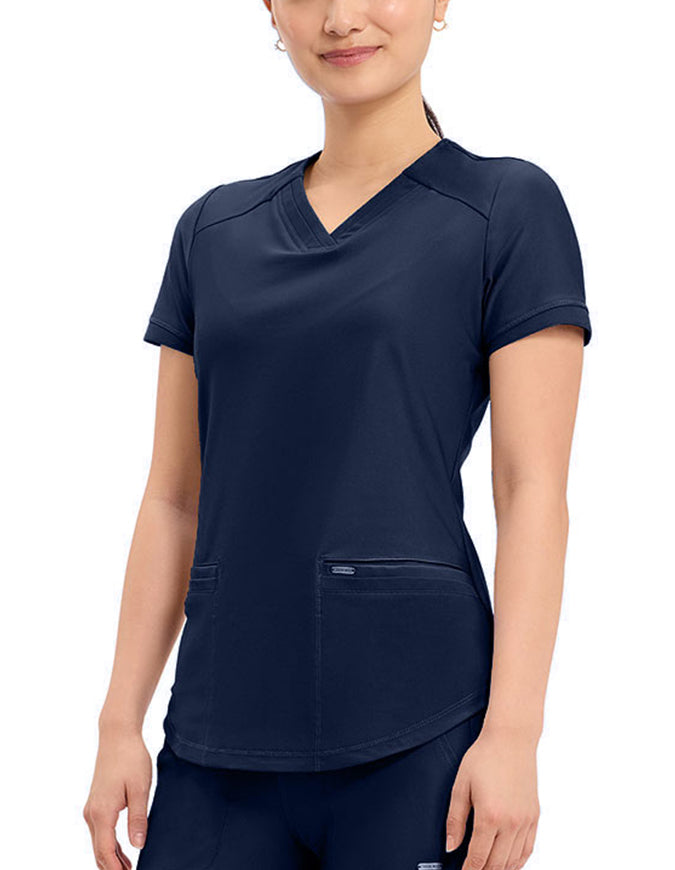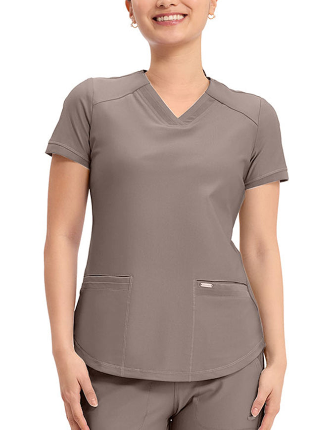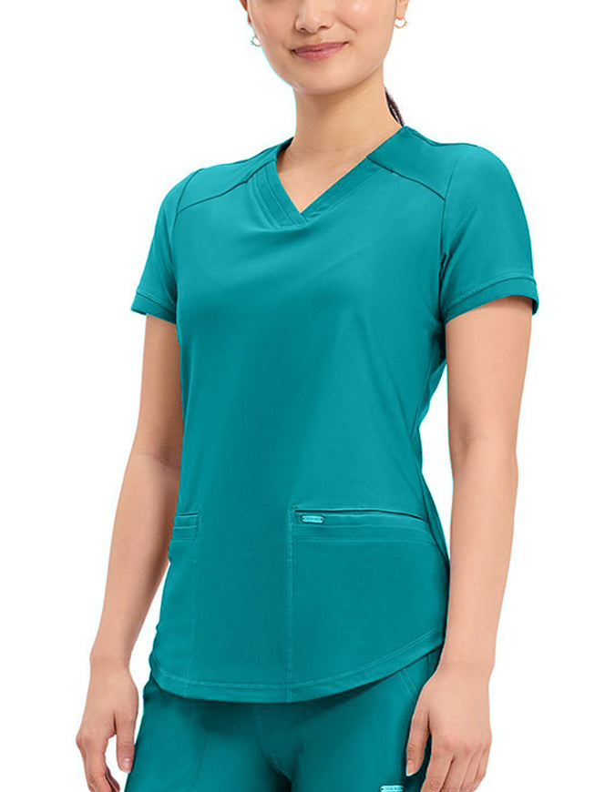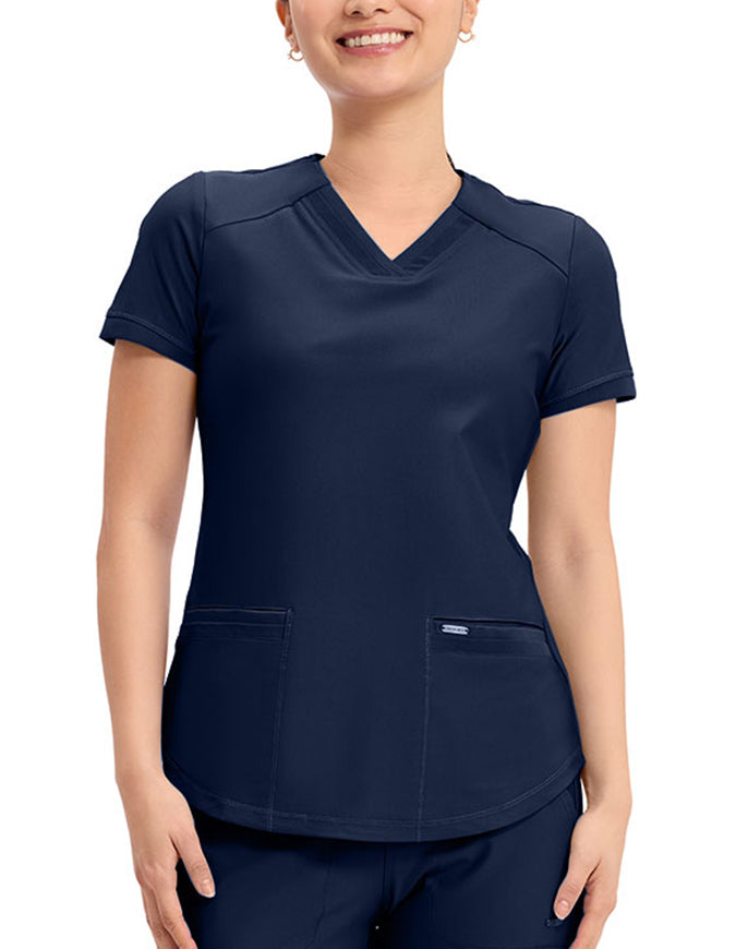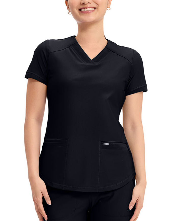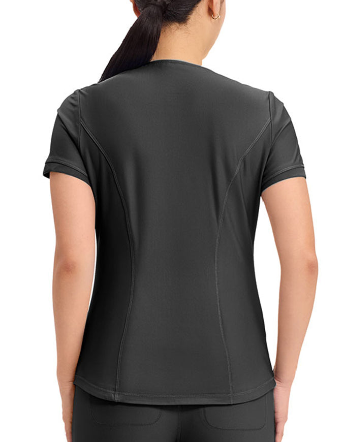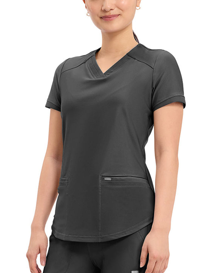 This stylish V-neck scrub top offers a modern curved hem and subtle power mesh detailing at the neckline and sleeve ends. Designed with two spacious front welt pockets, angled front yoke panels, and back princess seams, it enhances your silhouette beautifully. Features a contemporary fit with a center back length of 26 inches.