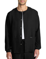 This unisex snap-front scrub jacket offers a comfortable fit with matching-color snaps and elastic cuffs. It includes two spacious patch pockets trimmed with reverse hems and a pen/instrument slot on the right pocket. Subtle tonal topstitching adds style, and the center back measures 28.5 inches for a polished, professional look.