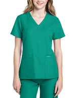 This modern classic fit V-neck scrub top features functional details that enhance its simple style. A flat bungee on the neckline offers an easy ID badge loop, while two spacious patch pockets include reverse hem trim. Side vents provide mobility, and tonal topstitching adds subtle flair. Center back length measures 26 inches for a polished look.