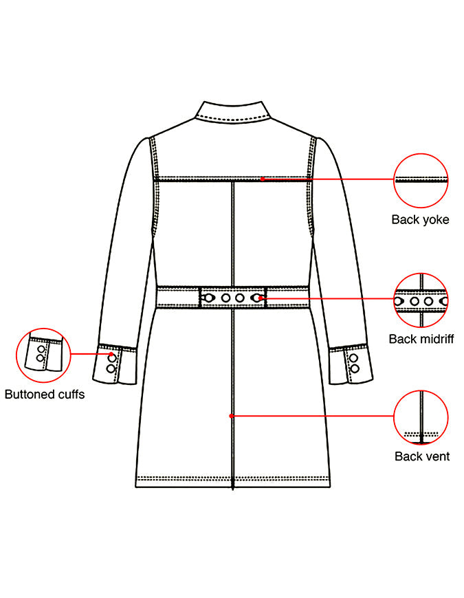 • Long set-in sleeves with buttoned cuffs for a structured fit