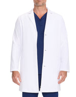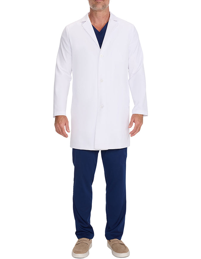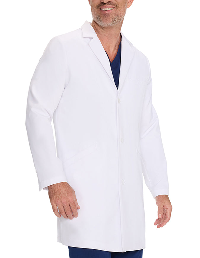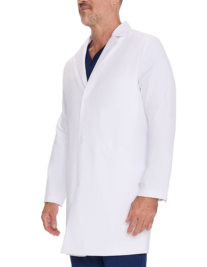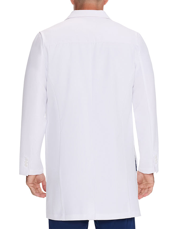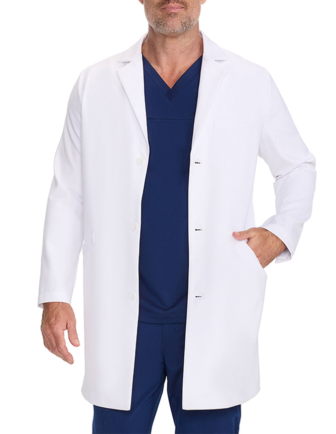 Healing Hands Men's Lab Coat in White The Healing Hands Men's Lab Coat in White offers professional style with functional design. Featuring a button front closure and six convenient pockets—including welt, chest, interior, and cell phone pockets—this coat also includes side access slits for ease of movement. With a center back length of 36 inches, it's a perfect blend of comfort and utility.