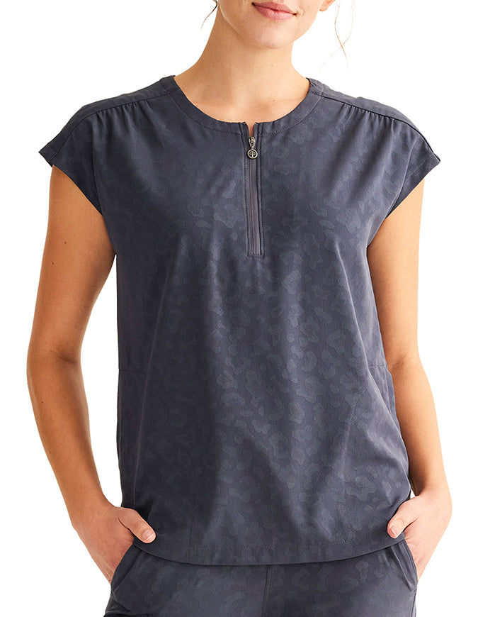 Refresh your workwear with the Jayden Leopard Jacquard Scrub Top from Healing Hands Purple Label. Designed to make a bold statement, this top features a chic leopard jacquard pattern and a trendy zip collar that adds a modern touch to your professional look. Crafted with performance fabric and a modern oversized fit, it blends fashion, comfort, and functionality seamlessly—perfect for long shifts or busy days.