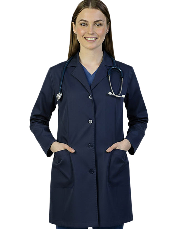 Known for its amazing tailoring and trendy accents, you get a custom fit. Featuring a notched collar with easy to wear five button closure, stay comfortable all day lone. With front and back princess seams that enhance your curves, back belt with button detailing and mock sleeve cuffs that stays in place - you get your desired functionality within your budget. Completed with a variety of spacious pockets, the lab coat is exactly what you need.