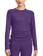 This Missy-fit long sleeve underscrub is designed with a round neckline, elastic ruching along the side seams, and a curved hem. The adjustable side-seam taping allows you to modify the length for a custom fit. With a center back length of 24", it blends comfort, flexibility, and style for everyday wear.
