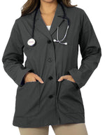 Feel fabulous and look great wearing the 29-inches women's coat by Panda Uniforms. It features a notched lapel collar with a four-button closure, long set-in sleeves to keep you secure, two roomy patch angled pockets to offer you complete storage space for your tools and instruments.